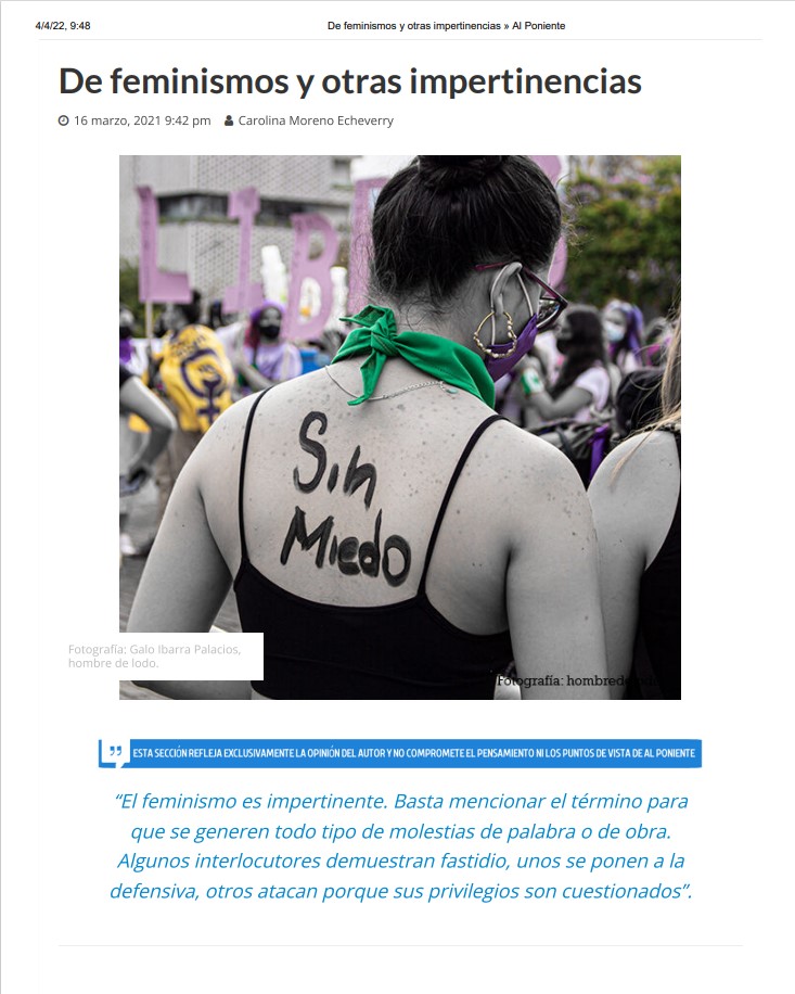 Marzo. Foto reportaje en colaboración con el texto De feminismos y otras impertinencias de la Dra. Carolina Moreno Echeverry para el diario digital colombiano Al Poniente de la ciudad de Medellín.