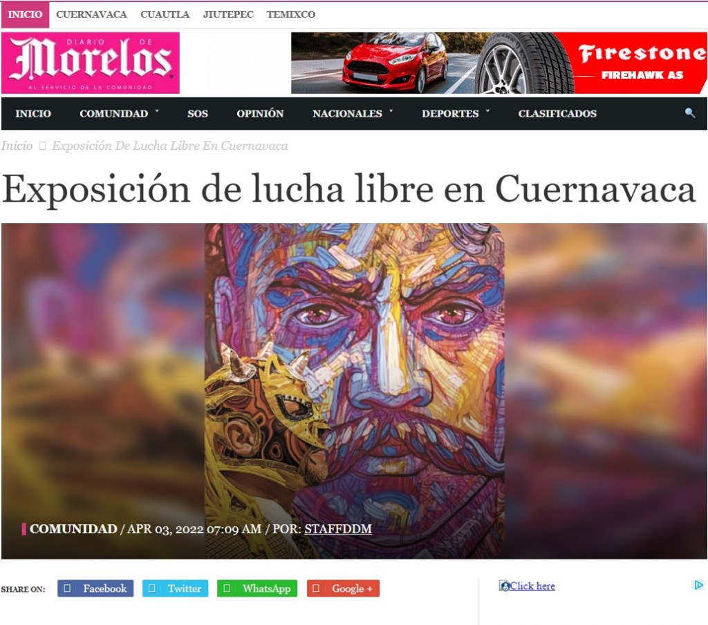 Marzo 3. Nota publicada por el Diario de Morelos, con motivo de la inauguración de la exposición colectiva Tercera Caída, inspirada en la lucha libre mexicana. https://www.diariodemorelos.com/noticias/exposici-n-de-lucha-libre-en-cuernavaca?fbclid=IwAR1NM06KyNcxose_3YGHx8ikBcTI-5tr-QGHivl2eLlrLg4KfuDyhfxC3vM